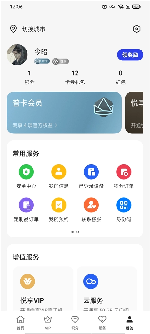 可以切换城市,展示用户的相关信息,包括积分、卡券等数据;无论是普卡会员还是悦享会员,都能享受到专门的权益,而且不同权益对应的服务内容存在明显差异。