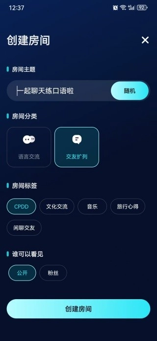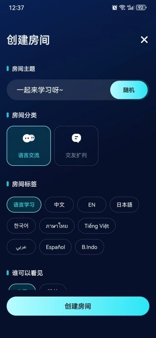 4、还在设置其他的房间主题,随机一个名字,进行其他分类和标签即可开始创建。