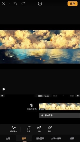 3、之后,你还能在这里添加喜爱的音乐;要是视频的话,既可以选用原音,也能添加自己喜欢的音乐、音效,或是进行录音。