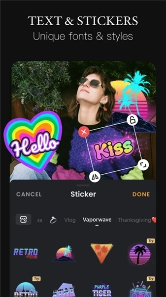 3、令人惊叹的视频编辑效果:包含VHS效果、FX效果等。这是一款兼具酷炫体验与专业功能的视频编辑应用,可添加音乐与文本。