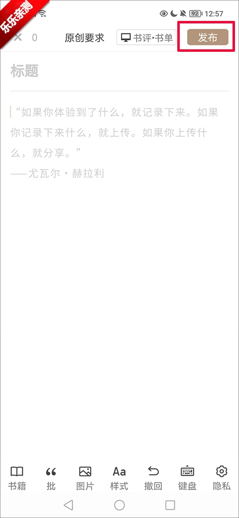 2、进入书评界面后,先填写标题与内容,接着点击右上角的发布按钮,就能完成稿件的发布操作。