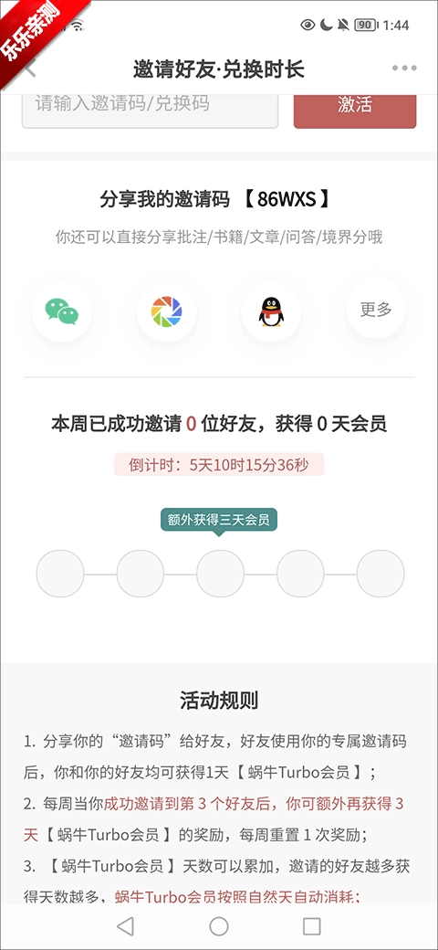 要是不想花钱,其实也有办法获取阅读时长——那就是邀请好友。通过个人中心的邀请好友功能分享邀请码,每成功邀请1位用户就能获得1天会员,这样就能解锁对应的阅读时长啦!