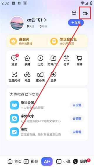 1、在百度个人中心页,点右上角功能菜单图标,能展开常用功能列表,找到隐私相关设置选项哦。
