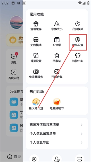2、展开功能列表后,点【隐私设置】选项,能进入隐私管理页面,可调整各类隐私相关的配置啦。