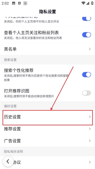 3、在隐私设置页,点【历史设置】选项,能进入历史记录的管理页面,调整历史记录的开关状态呢。