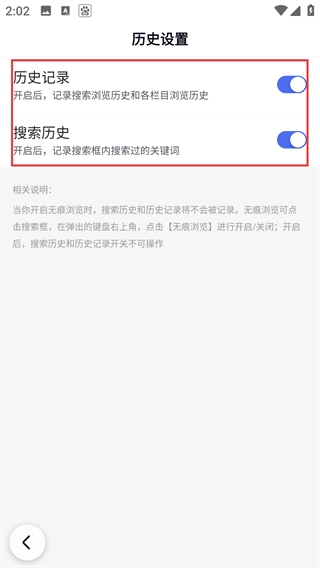 4、在历史设置页,关闭【历史记录】开关,就能停止记录搜索和浏览的历史信息啦。
