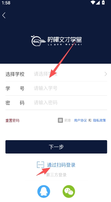 3、在登录页面,选择学校所在、输入学号和密码登录,如果觉得比较麻烦的话,也可以通过微信或是QQ的方式登录进入。