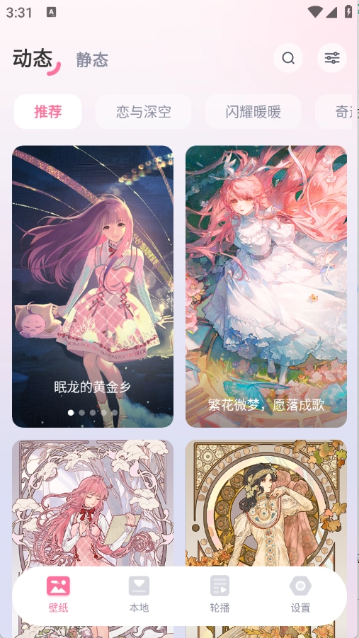 分类很详细,不管是风景类、动漫类还是萌宠类等都有,满足不同用户的手机桌面美化需求,还会根据用户的喜好智能精准推荐壁纸资源,适配各种手机型号,打造专属不一样的手机桌面。