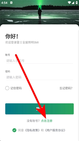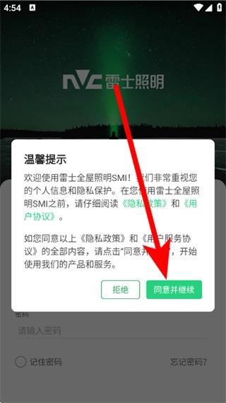 1、打开雷士全屋照明SMI,在温馨提示弹窗,点击同意并继续,进入登录页面。