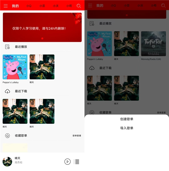 软件界面非常简洁,操作也非常简单便捷,拥有和其他音乐平台一样的历史播放、记录、创建歌单功能