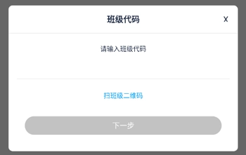 4、点击添加班级代码后弹出班级代码窗口,可输入代码或扫描班级二维码,完成后点击下一步即可关联对应的学习班级。