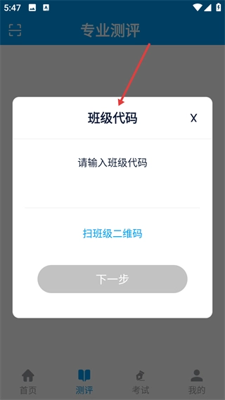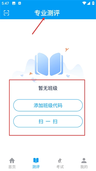 3、进入专业测评页面,若显示暂无班级,可通过添加班级代码或扫一扫这两个功能,关联对应的学习班级以便参与测评,大家平时做测试或是模拟考试都是在这里查测评结果。