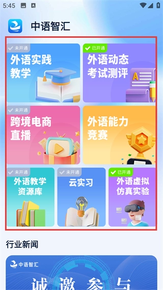 2、登录后进入首页,可看到外语实践教学外语动态考试测评等功能模块,显示已开通的是完整的教材部分,未开通的则是一边授课一边跟进的学习部分。