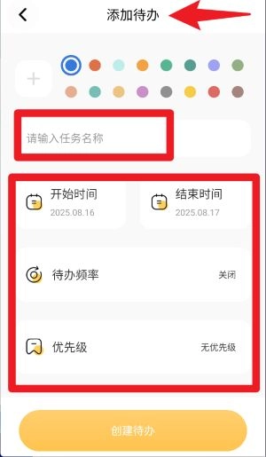 2、进入“添加待办”界面,填写任务名称,设置开始和结束时间,同时选择待办频率及优先级,最后点击创建待办即可。