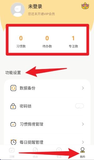 5、点击底部“我的”进入个人中心,可查看习惯数、待办数和专注数,并进行数据备份、密码锁设置及提醒管理。