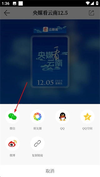 在分享菜单中,选择微信,即可将新闻分享到微信。