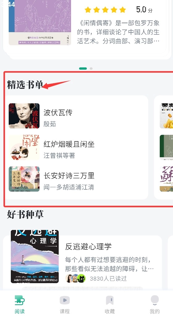 精选书单板块由编辑依据主题筛选并推荐优质读物合集,覆盖文学、社科等多个领域的经典作品。