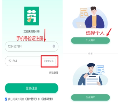 注:学生注册:使用手机号验证注册,选择个人用户。