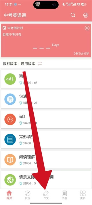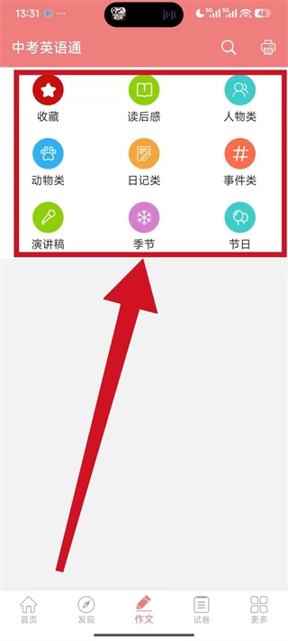 1、打开中考英语通,点击底部导航栏的作文,进入作文分类页面。