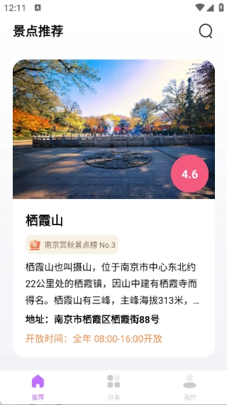 1、在推荐页面中可以了解景点推荐的景区信息,也可以进行搜索景点;