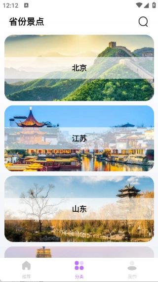 3、在分类页面中根据不同的省份城市进行了解当地的景点信息;