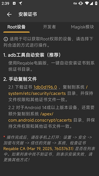 另外,若用户不愿通过远程方式安装证书,也可选择导入手机本地或电脑中已有的证书来完成安装操作,但在导入证书之前,依旧需要先对手机设备进行root处理。