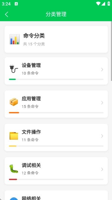 安装应用后进入主界面,查看完整的命令列表,顶部区域支持切换不同的功能分类。