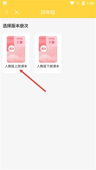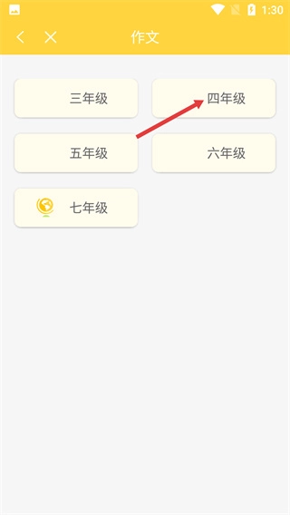 1、进入作文的年级选择页面,点击【四年级】选项,选定对应年级,进入版本册次的选择界面。