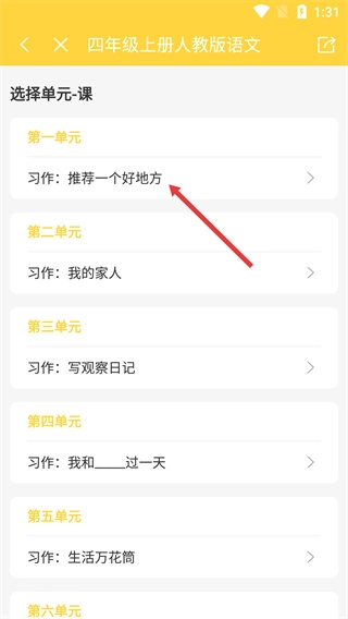 3、在单元-课选择页面,找到第一单元的【习作:推荐一个好地方】选项,点击进入该习作的专属指导页面。