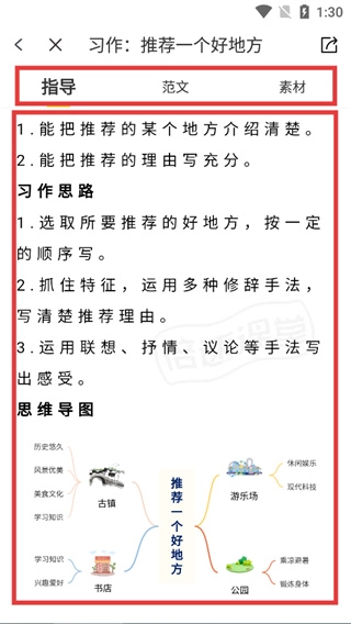 4、在该习作的指导页面,可查看习作要求、写作思路及思维导图,借助这些内容辅助完成“推荐一个好地方”的作文创作。