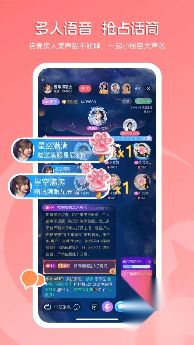 语音连接交互:具备多人语音连接能力,用户能够和主播以及其他用户进行实时交流。