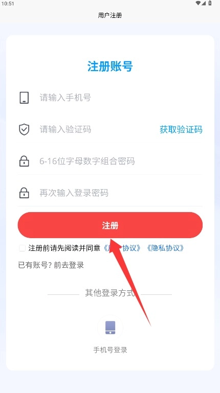 1、填写手机号并输入验证码,设置登录密码,勾选同意相关协议后点击注册按钮,即可完成账号创建。