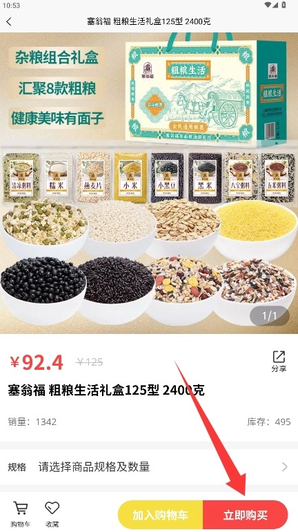 4、进入商品详情页面后,点击页面右下角的立即购买按钮,就能完成购买流程。