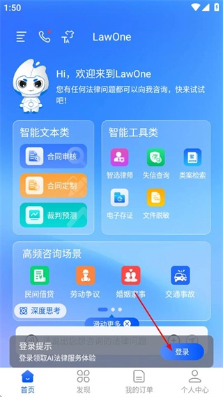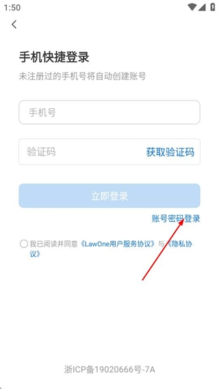 1、进入lawone首页后,点击登录按钮,可进入手机快捷登录页面。