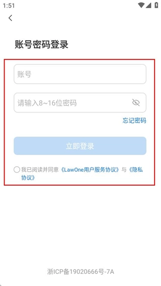 3、在账号密码登录页面,填写信息并勾选协议后,点击立即登录按钮即可完成账号登录。