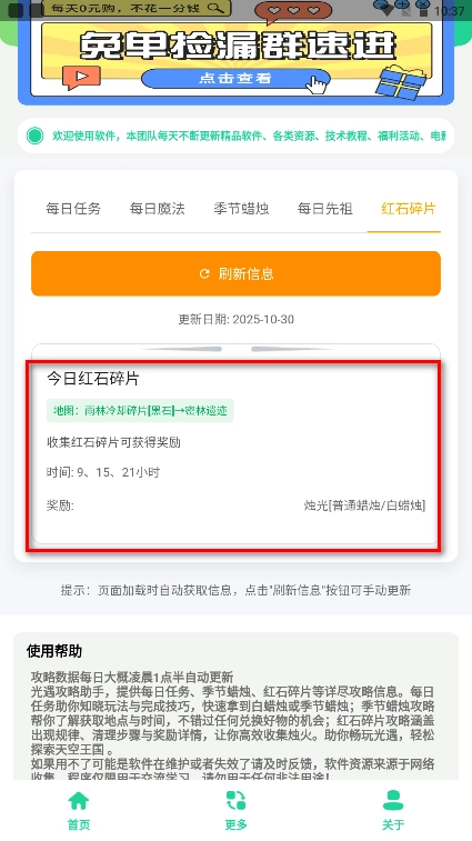1、任务与资源指引:提供每日任务解析、季节蜡烛位置标注、红石碎片刷新提醒等基础攻略服务。
