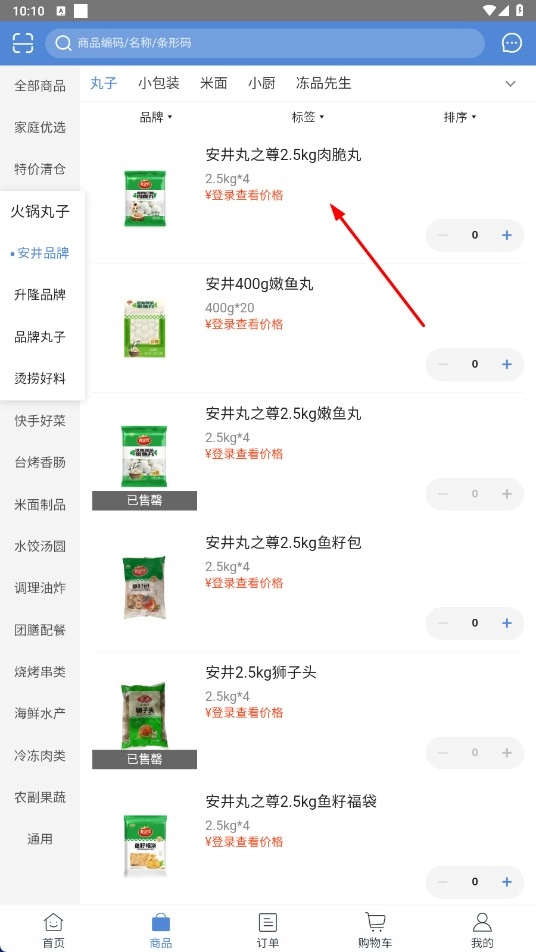 3、在商品列表中找到类似【安井丸之尊2.5kg肉脆丸-商品名称】这样的商品并点击,即可进入商品详情页。