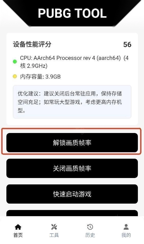 1、在本站完软件后,打开进入到主界面点击解锁画质帧率。