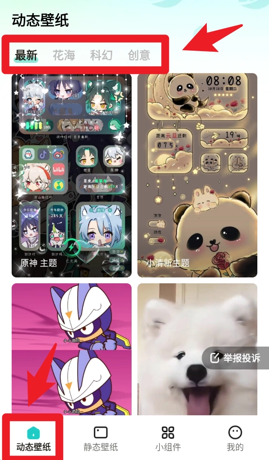 2、进入首页后点击动态壁纸栏目,就能在最新、花海、科幻、创意等不同分类里挑选自己喜欢的动态壁纸。