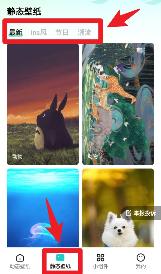 4、切换至静态壁纸板块,能够在最新、ins风、节日、潮流等各类不同分类里进行浏览与挑选静态壁纸。