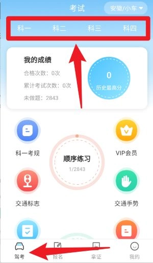 1、进入驾校驾考宝的驾考页面后,能在顶部挑选科一、科二、科三或科四对应的学习板块,依据考试科目开展有针对性的练习。