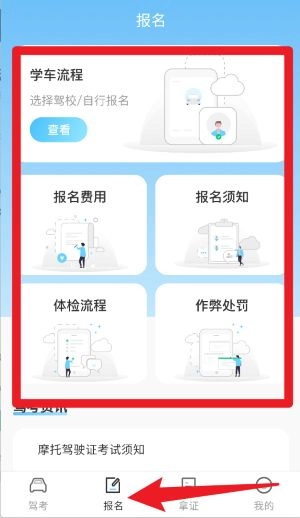 3、在报名页面,学员可查看学车流程、报名费用、报名须知、体检流程及作弊处罚等信息,以便做好驾考报名准备。
