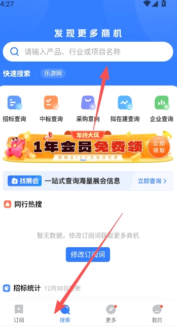 3、搜索与会员展示板块:通过快速搜索功能可发掘更多商机,若需查询中标结果,无论是输入公司名称还是项目信息,均可在此处完成操作。