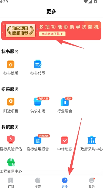 4、解锁更多可能,多维度助力挖掘商机,覆盖标书服务、招采服务、数据服务等多元线上内容,关于招标的各类需求,这里一应俱全。