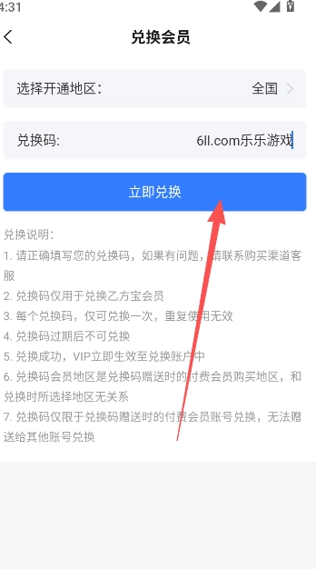 2、挑选会员开通地区的所在地,输入兑换码的具体内容,操作完成后点击“立即兑换”按钮。