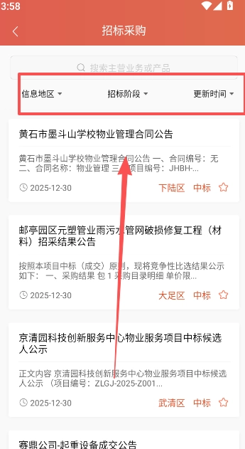 3、回到之前的页面,挑选你有意向参与投标的工程项目,依据信息地区、招标阶段和更新时间这些条件来开展筛选工作。