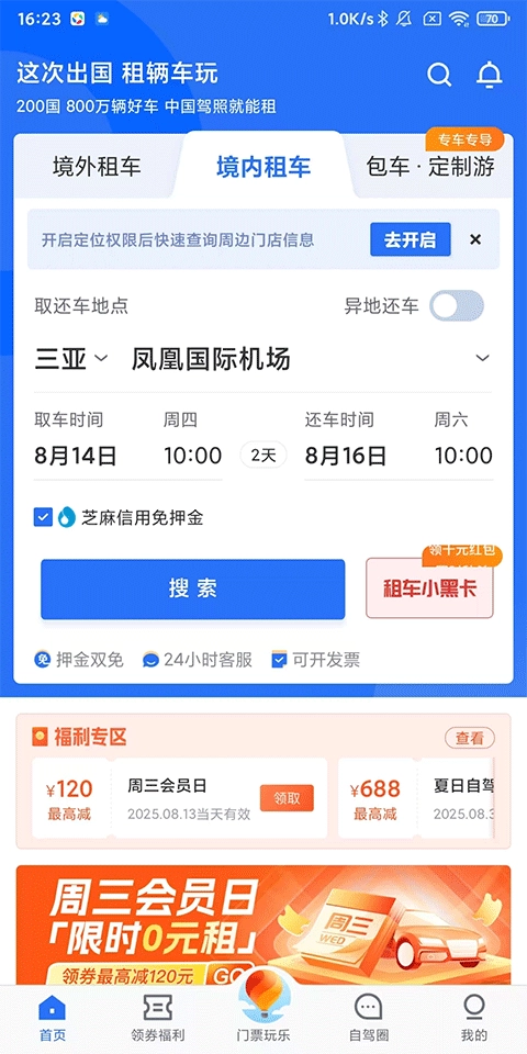 2、境内租车:支持免押金服务,覆盖600多个城市,提供上千款车型可供挑选;