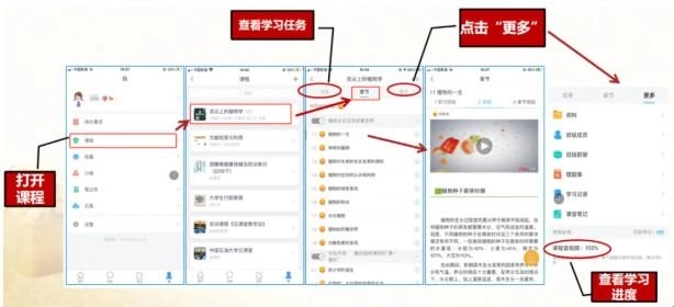 课程学习时,在“我”的界面,进入“课程”,找到相应的课程,即可进行学习和任务的查看。