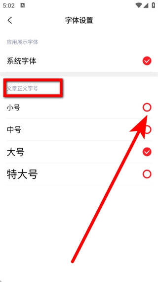 4、在字体设置页面,点击文章正文字号,完成资讯阅读字体大小的调整。