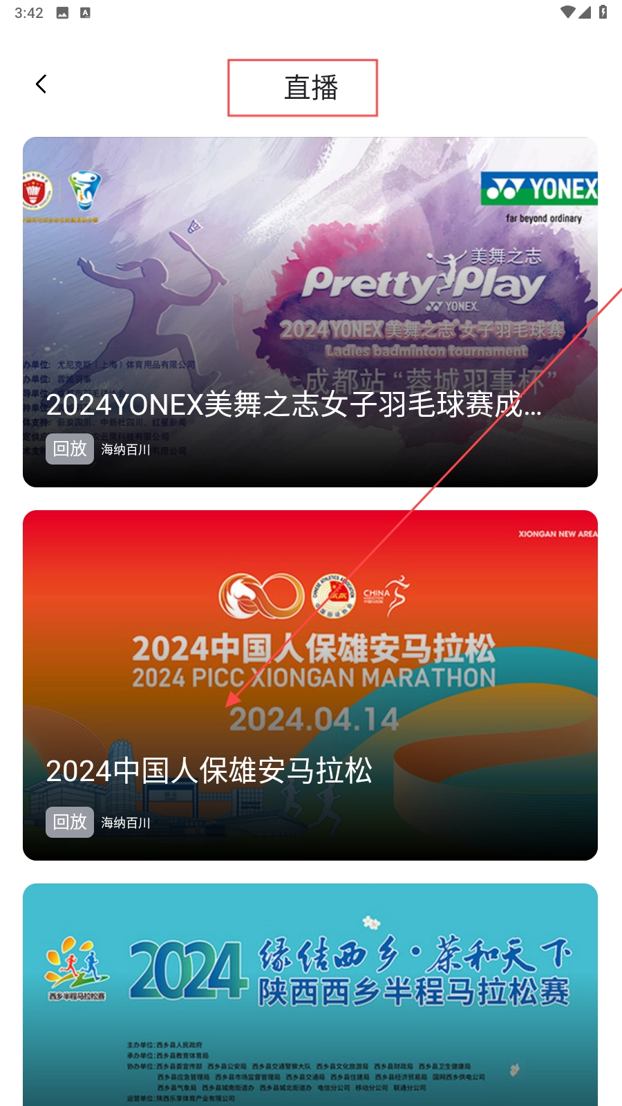 3、在【直播】页面点击赛事封面观看【2024中国人保雄安马拉松】回放。